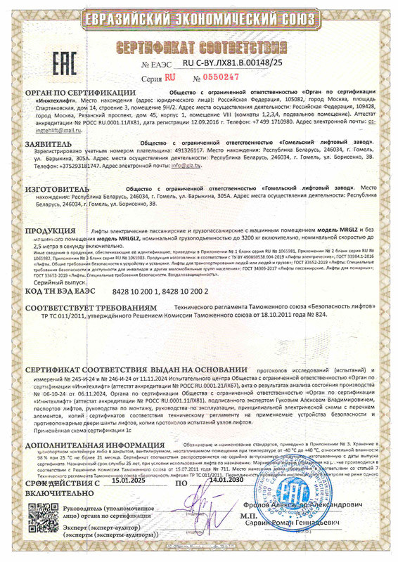 Сертификат соответствия требованиям Технического регламента Таможенного союза ТР ТС 011/2011 "Безопасность лифтов"